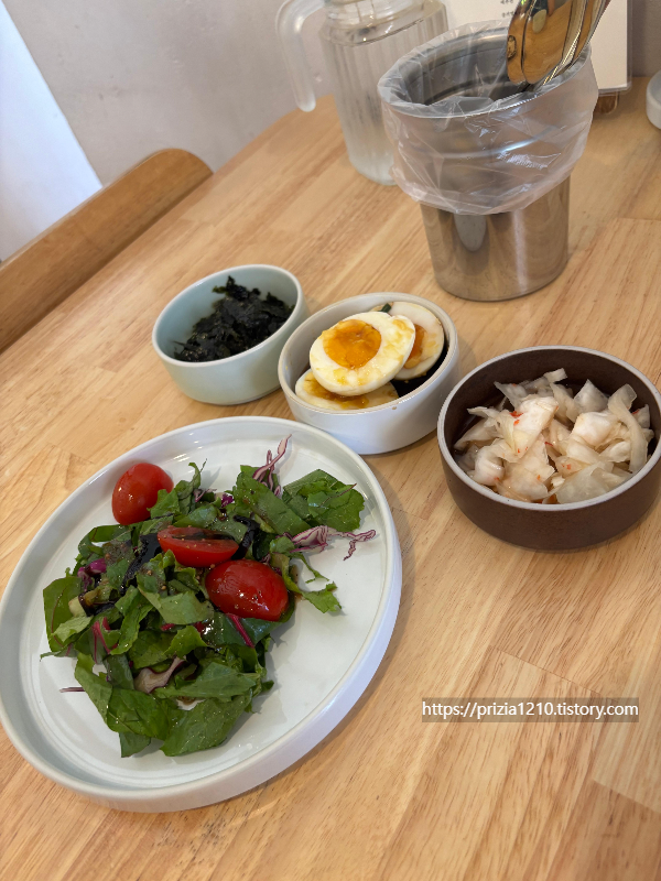 기본찬으로 계란장과 백김치 샐러드가 나왔다.
