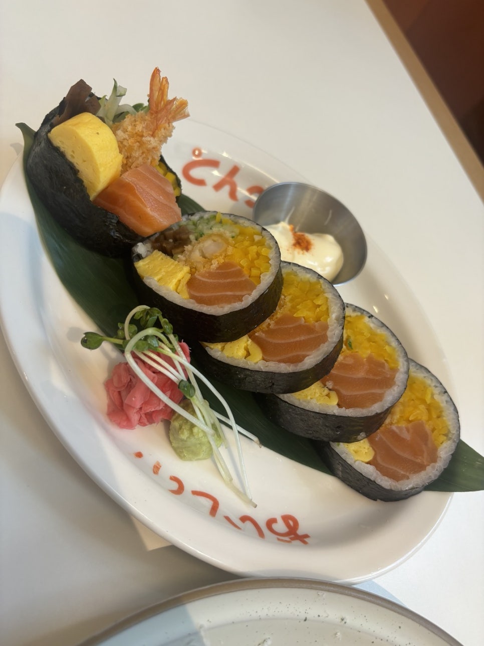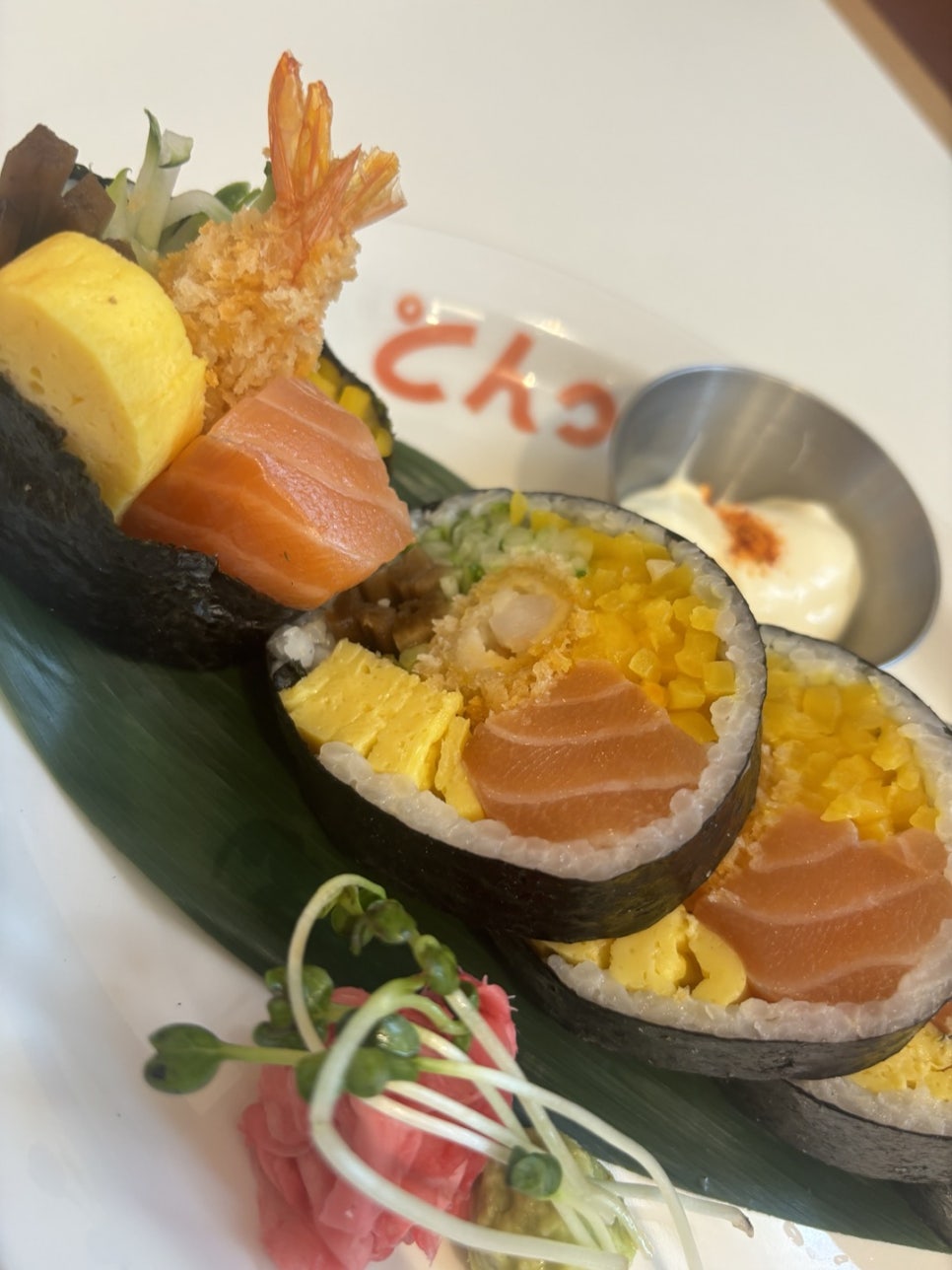 새우튀김도 함께 들어가 있는 연어 후토마키는 1인분에 5 pcs 가 나온다.