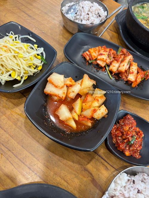 밑반찬은 슴슴한 콩나물과  새콤한 깍두기