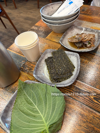 • 매콤한 꼬막비빔밥과 김, 깻잎을 싸먹으니 그 풍미가 더해져 맛있었다.