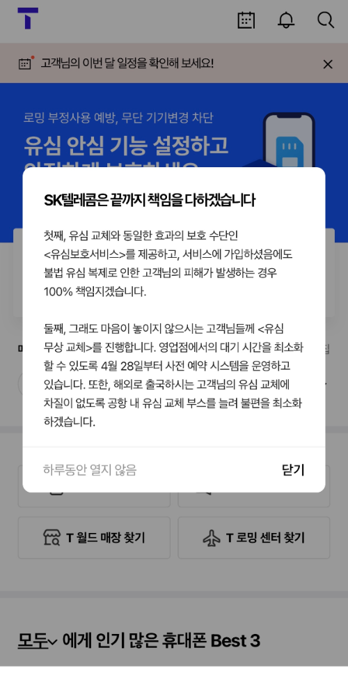 접속하면 바로 문제가 되고 있는 유심해킹에 대한 안내와