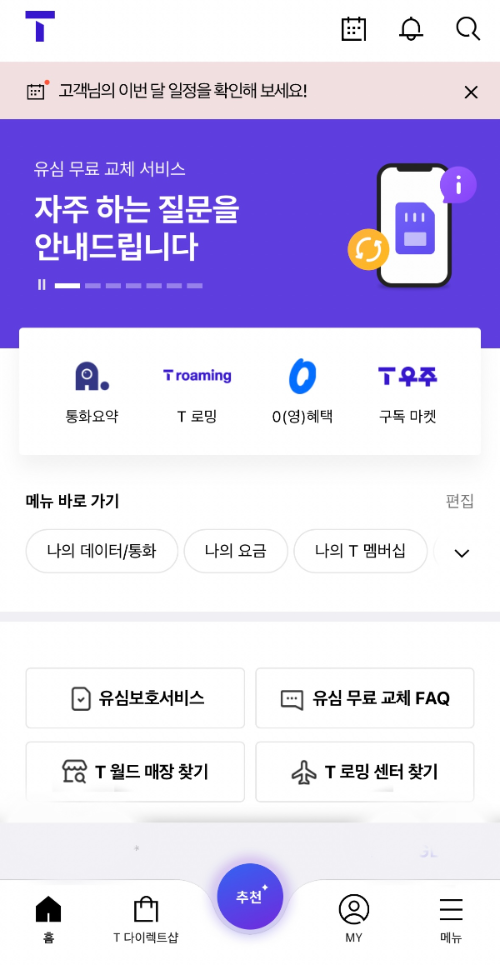 유심교체 예약하기 등이 메인 화면에 뜬다.