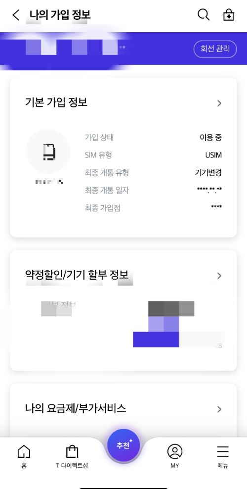 내 가입정보와, 약정정보 등이 나와있다.