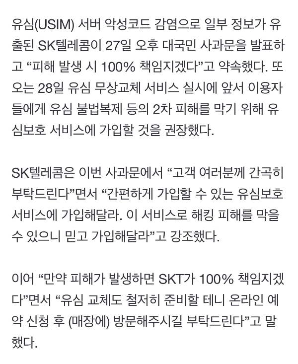 지금 sk 유심서버가 악성코드에 감염된게 확인되어